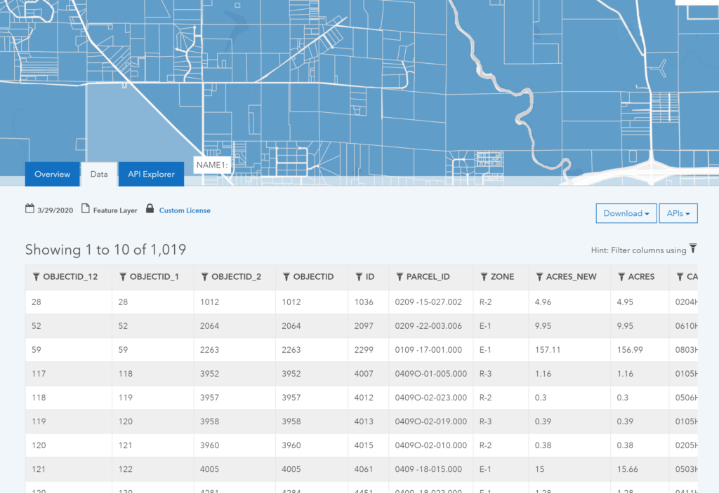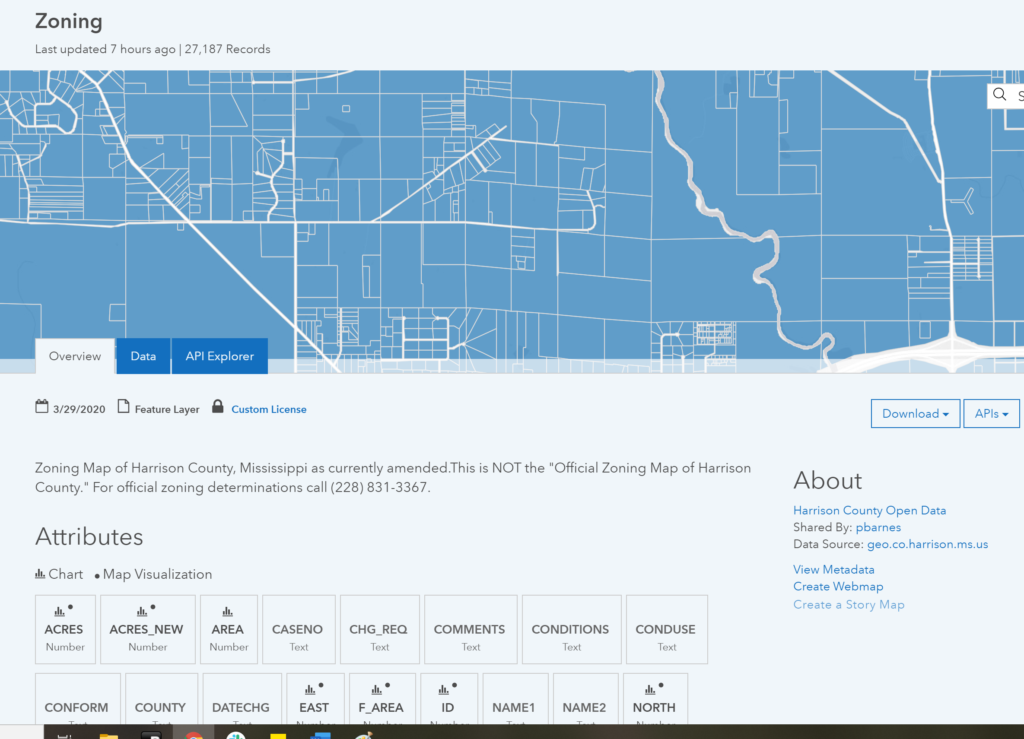 ArcGIS Hub gives you access to an open data site with data galleries, basic data viewing, filtering, data downloads, and access APIs. You can create various sites and pages to allow for easier data discovery or targeted community engagement. View the gallery below to see what some of those features look like in the Harrison County Open Data Portal.