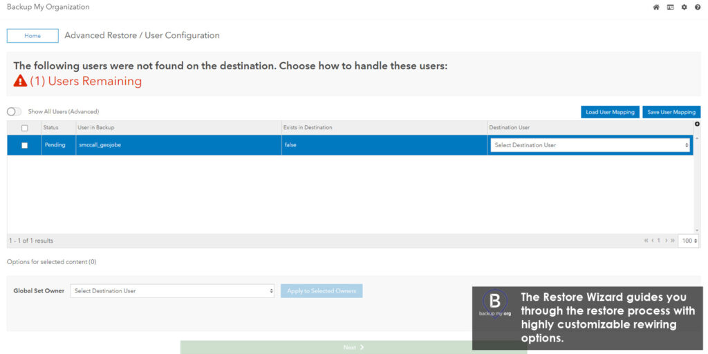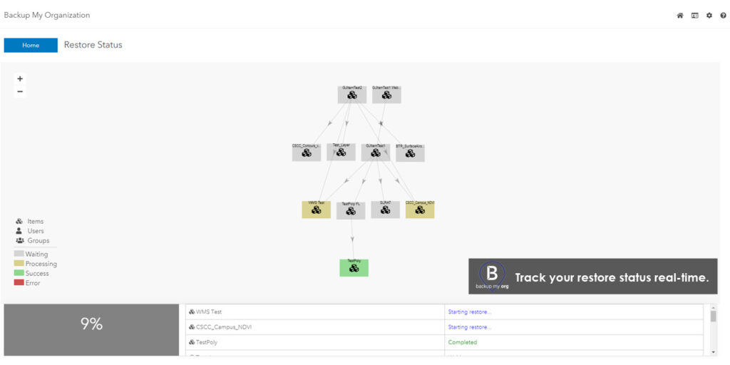 With Backup My Org, ArcGIS Administrators can backup AND RESTORE an organization, or individual items, users, and groups to and from their local hard drive, providing even greater management and peace of mind of their ArcGIS Enterprise or ArcGIS Online Organization.